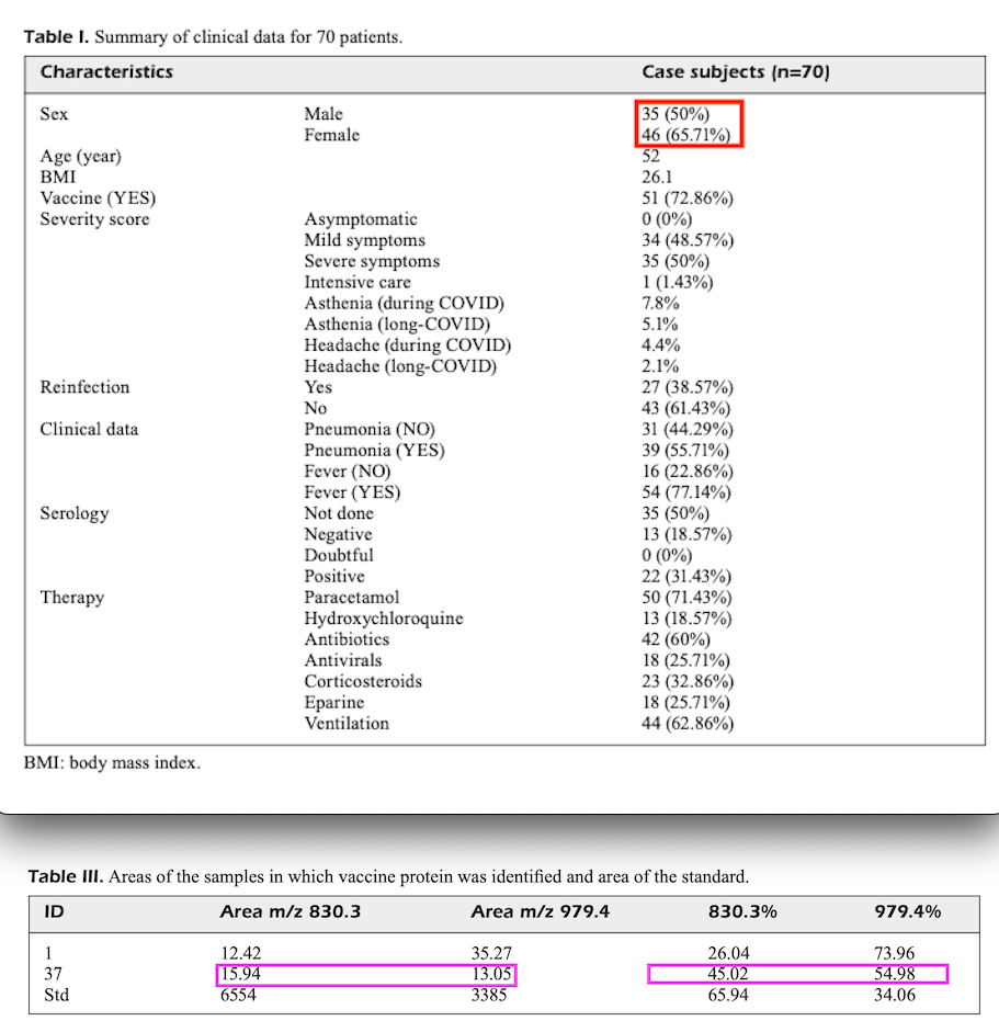 - Out of the 81 long-COVID samples tested, only one patient sample was reported to contain the viral spike protein, while two others had the signature of the vaccine spike protein. The paper does not include a control group, so it is not clear if these might be false positives or aspecific signals.