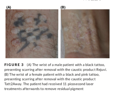 - Sequels to tattoo removal by caustic products – Hutton Carlsen and Serup – Skin Res Technol. 2018;1–6 – DOI: 10.1111/srt.12578
