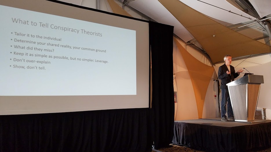 Mick West of Metabunk and Contrail Science describes himself as a debunker. He started off his talk by saying that a lot of his explanations rely on science and mathematics, but that most people have very limited understanding of those, and think everything is a conspiracy.