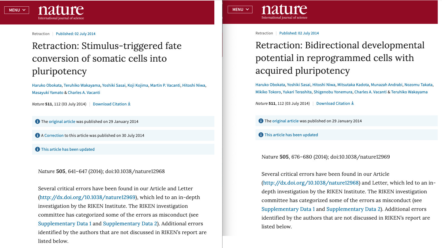 The Riken institute started an investigation and concluded that Obokata manipulated image data or re-used images to represent a different experiment. Both Nature papers were retracted in July 2014.