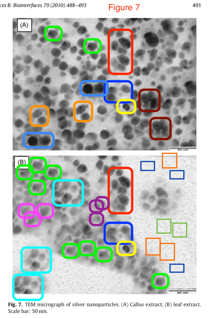 This 2010 Colloids and Surfaces B Biointerfaces paper contains two photos with possible repetitions of the same nanoparticles (PubPeer).