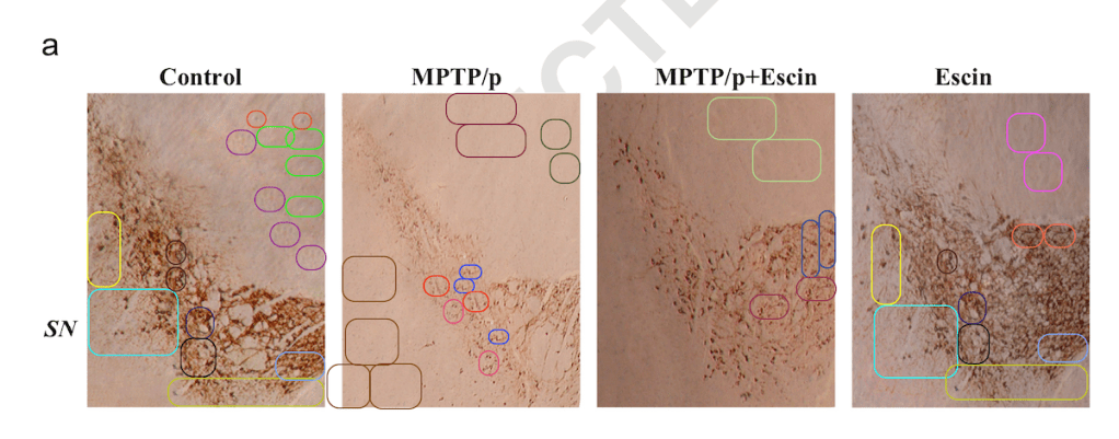 In this 2014 Brain Research paper, the same tissue areas appear to be visible multiple times within the same photo, or across different photos. Of note, the “Control” panel and the “Escin” panel appear to share many similar features (PubPeer).