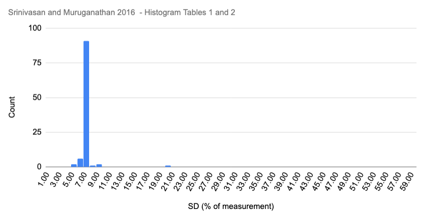 A particular puzzling phenomenon was observed in a set of papers with animal measurements. Usually, 4 to 6 groups of 6 rats each were treated with different chemicals, and measurements were reported as mean plus/minus a standard deviation (SDs). One would expect that the spread of these many averages would be somewhat variable, but unexpectedly, almost all SDs were around 7.5% of their mean, such as in this 2016 Chemico-Biological Interactions paper (PubPeer). Such a narrow range of SDs is highly unusual in biological measurements.