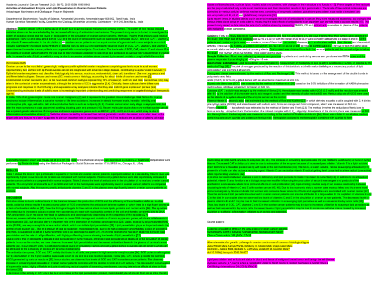 Some of the papers published by Annamalai researchers appeared to have reused text published by others. This 2009 Academic Journal of Cancer Research paper had little original text. The sentences marked in yellow, pink, and green are verbatim identical to text found in three older papers by different authors.