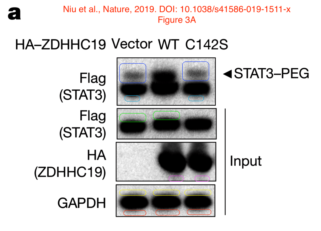 Jixiao Niu et al., EMBO Journal (2011) appears to have duplicated lanes in several figures, as highlighted on PubPeer. Here is a selection of some of these similarities, all highlighted with colored boxes.