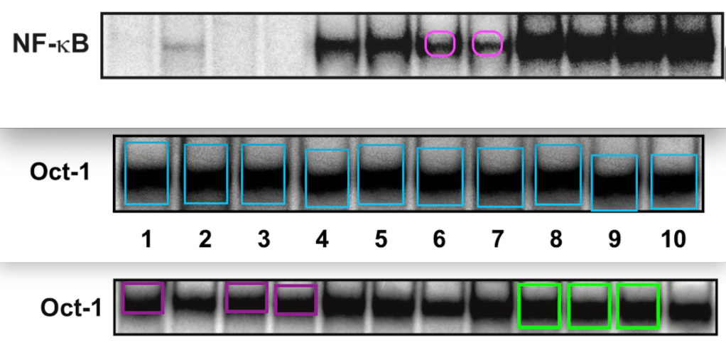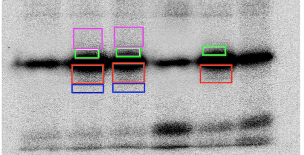 Although the bands had different shapes, the areas just above and below some bands appeared to be repeated in other lanes within the same photo. Here is a figure illustrating the patterns I was seeing in three figure panels in Figures 2 and 3. The colored boxes were added by me, and boxes of the same color highlight areas that look unexpectedly similar to each other.