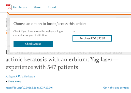 The paper’s title is: Management of seborrhoeic keratosis and actinic keratosis with an erbium:YAG laser—experience with 547 patients, doi: 10.1016/j.ijom.2018.08.008, by A. Sayan et al.