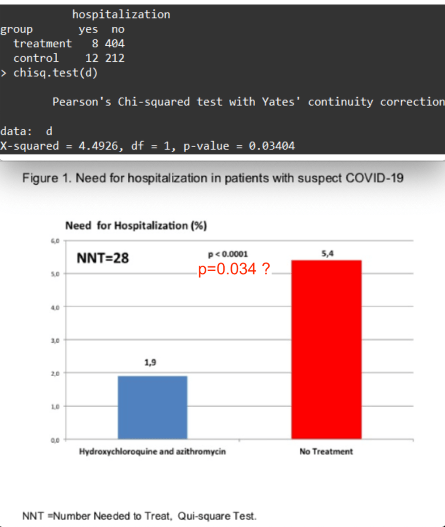 Another possible error in the paper was noted by Twitter user @houndcl (Lu Chen). Figure 1 shows the very small p-value of a chi-square test (misspelled) of p<0.0001, while the actual numbers appear to give a p=0.034.