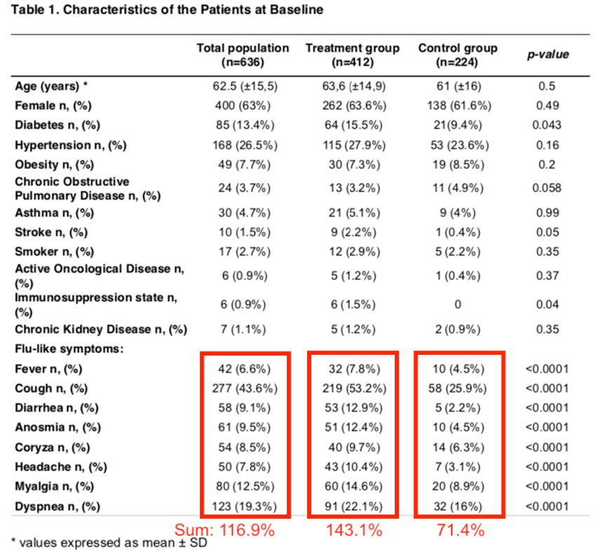 But look at the Control group: the summed percentage of the “flu-like symptoms” in the Control group is only 71%! Because that is below 100%, that suggests that several Control group patients did not have any of the listed COVID-19 symptoms. So why were they enrolled in the first place?