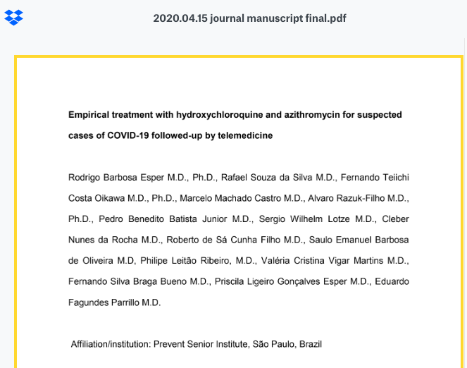 The authors are all affiliated with the Prevent Senior Institute in São Paulo, Brazil. The study was pre-registered at Clinical Trials under identifier NCT04348474, “Efficacy and Safety of Hydroxychloroquine and Azithromycin for the Treatment of Ambulatory Patients With Mild COVID-19” although the current status is “Not Yet Recruiting”.
