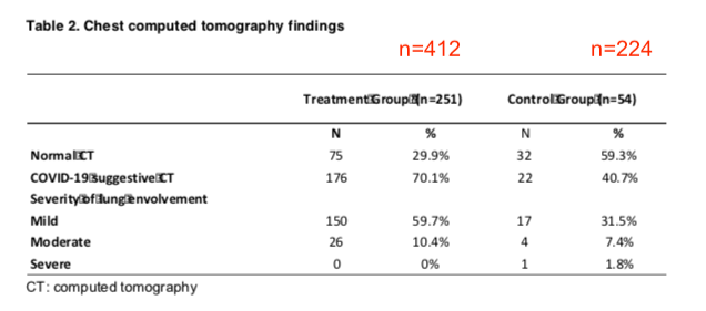 Of the 412 Treatment patients, 251 went in for a CT scan. That is about 61% of the patients. Of these, 70% had COVID-19 suggestive results.