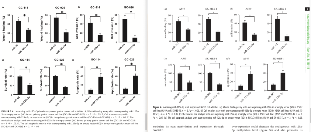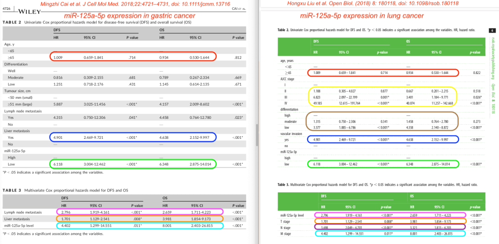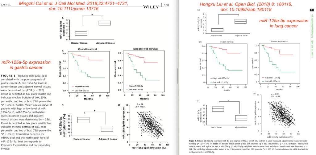 Of course, I was intrigued, so I compared the two papers to each other. They were from different authors at different hospitals, published in different journals, and although both groups studied miR-125a-5p expression, they did so in different types of cancer (gastric vs lung cancer).