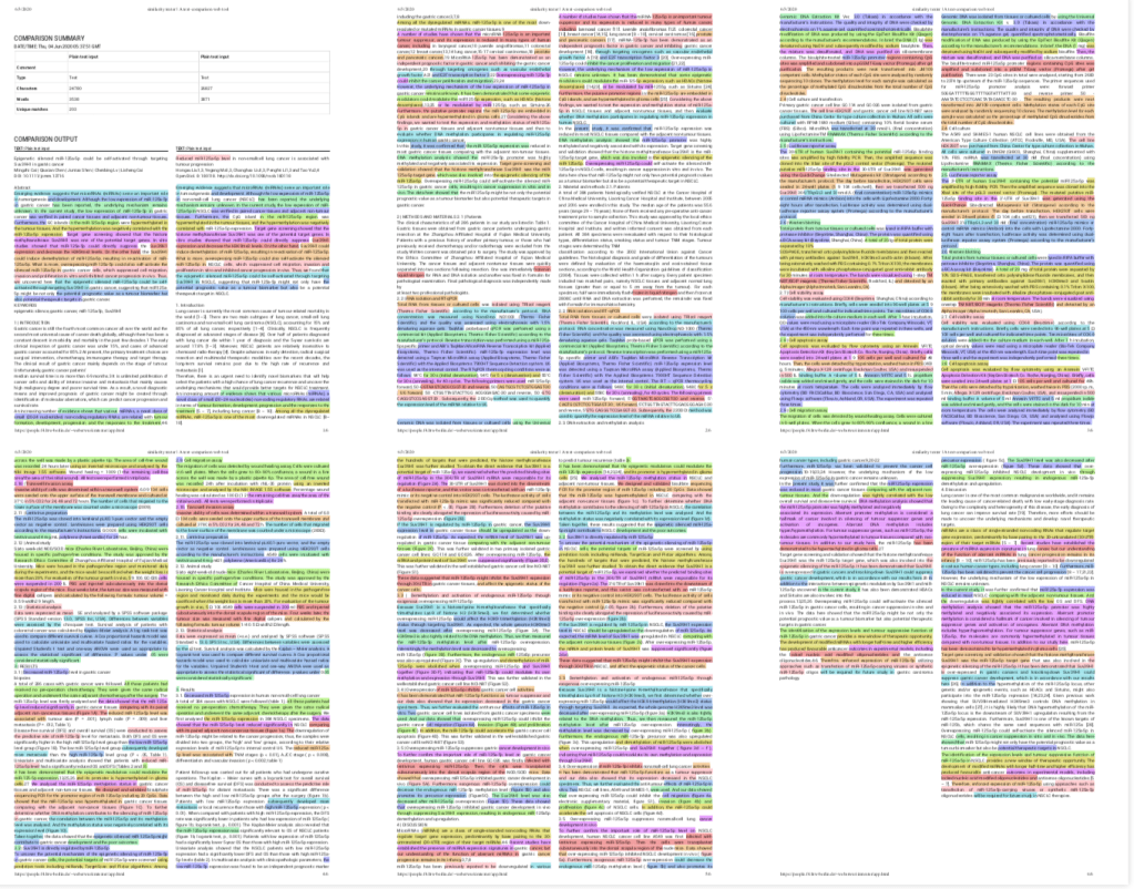 The text of the two papers, in particular the abstracts, Methods, Results, and Discussion sections were very similar to each other, as the SimTexter analysis below showed. Blocks of text in the same color show verbatim textual similarities. Only parts of the introduction and patient description were significantly different, which is not surprising because these papers described very different types of cancers.
