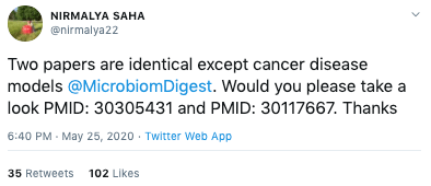 My investigation started with a tweet by Nirmalya Saha, who asked me to look at two identical papers, PMID: 30305431 (Liu et al., Open Biology, 2018) and PMID: 30117667 (Cai et al., J Cell Mol Med, 2018)