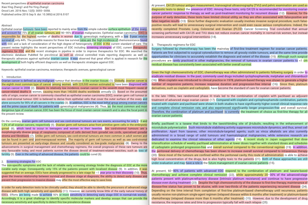 As an example, here is the text from paper #2, “Recent perspectives of epithelial ovarian carcinoma” which I compared to the text of a 2014 PhD thesis “Identification of Functional targets in Epithelial Ovarian Cancer” available at Core, an Open Access repository for papers and theses.