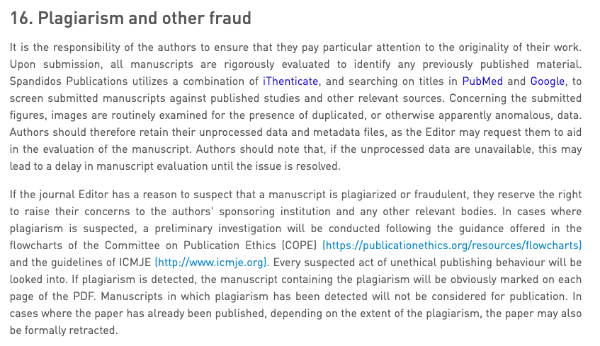 Spandidos’s Editorial Policies sound very robust and strict: “Upon submission, all manuscripts are rigorously evaluated to identify any previously published material. Spandidos Publications utilizes a combination of iThenticate, and searching on titles in PubMed and Google, to screen submitted manuscripts against published studies and other relevant sources.