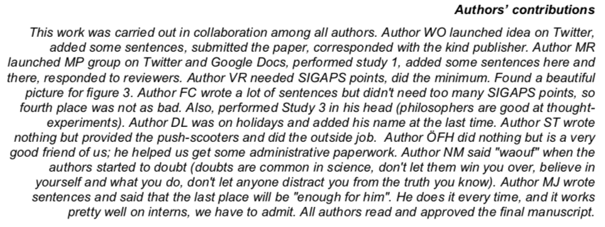 But even if you would not immediately grasp that most author names or their affiliations are meant to be funny, the Authors’ Contributions should make it very clear that this whole paper was a joke.