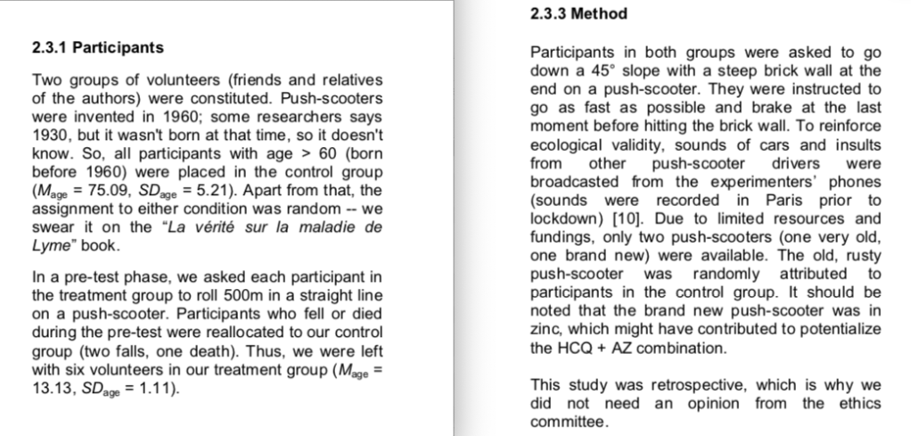 The study – jokingly – claimed that ‘push-scooter related accidents’ (PSA) were zero in March 2020, and thus ‘hydroxychloroquine was an effective preventive therapy for PSA with a RR = 0 (p<0.0001).’
