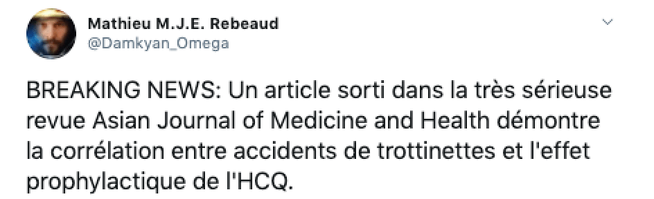 Yesterday, it published an obviously fake study that claimed that hydroxychloroquine could prevent push-scooter accidents – but only in Marseille. The paper has a lot of references to French scientists and politicians, and one of the authors is a famous French dog.