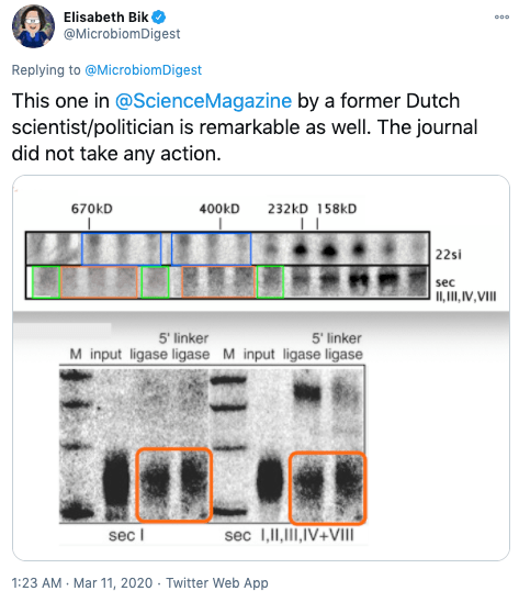 Now, I’m a patient person. But five years seemed an awfully long time to wait. So in March 2020, I tweeted about the paper’s problematic images, a full five years after reporting them to Science. This was part of a Twitter thread on unaddressed image problems in top scientific journals.
