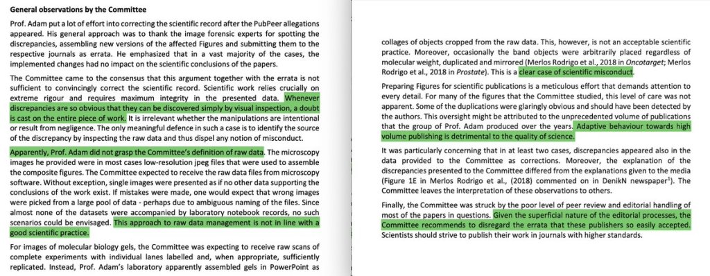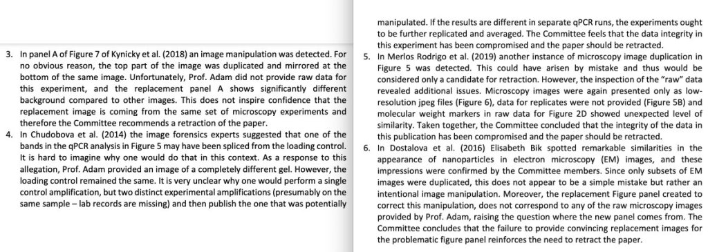 • The committee members did not blindly accept the ‘raw data’ provided by Professor Adam. Instead, they found that these ‘original’ figures did not match the published images, or that they appear to have been recently created or assembled.