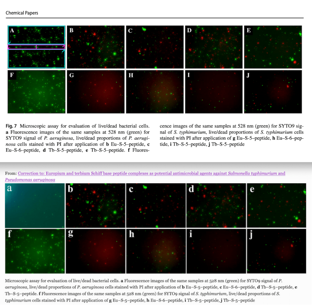 Bottom: Replacement figure in the Correction, which states that ‘inadvertently the same microscope image was used twice to represent the control’ – without wording indicating the image might have been manipulated. Source: https://link.springer.com/article/10.1007/s11696-021-01998-w