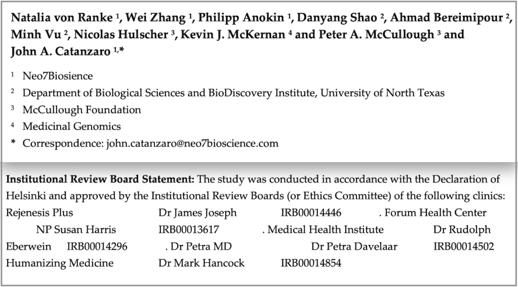 The “independent precision-medicine clinics” are “integrative”, “holistic”, “naturopathic”, etc, and all seem to rather small practices that I would not expect to have a very active IRB. From Dr. Catanzaro’s response it would appear that these were patients who had their genes sequenced as part of their treatment.