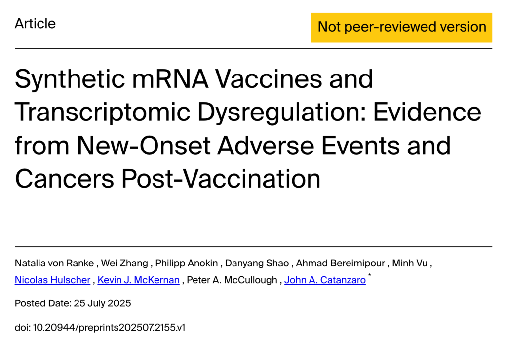 Today, 25 July 2025, a preprint was posted claiming that significant gene expression changes were found in individuals with new-onset cancer and other diseases after receiving mRNA COVID-19 vaccines, compared to healthy individuals.