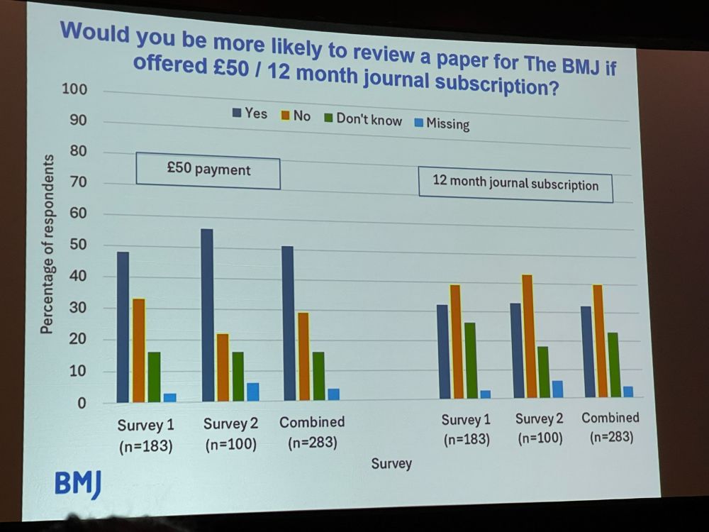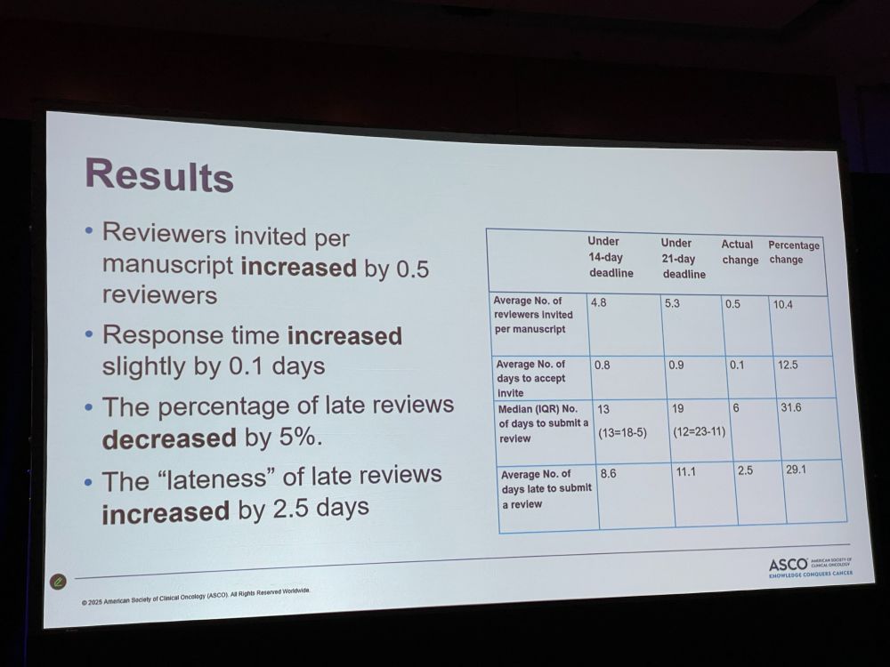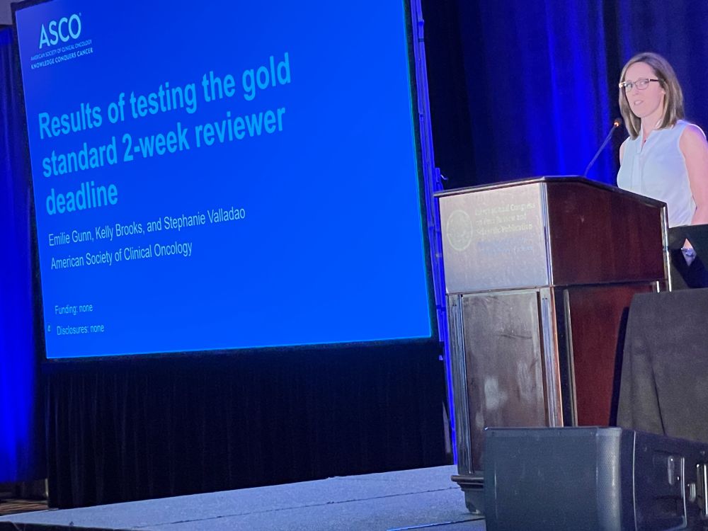 Late afternoon session, moderated by Kirsten Bibbins-Domingo @kbibbinsdomingo.bsky.social: “Peer Review Times and Payment Incentives” with Emilie Gunn@emiliemgunn.bsky.social about “Results of Testing the Gold Standard 2-Week Reviewer Deadline” Editors at JCO Oncology Practice struggle to find reviewers (like all editors!).