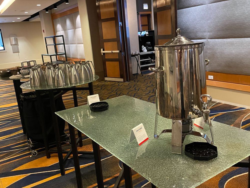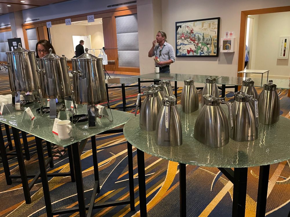 There is just one coffee pot (the other two are decaf and hot water) and TEN milk pots. This is not a good ratio 🤣