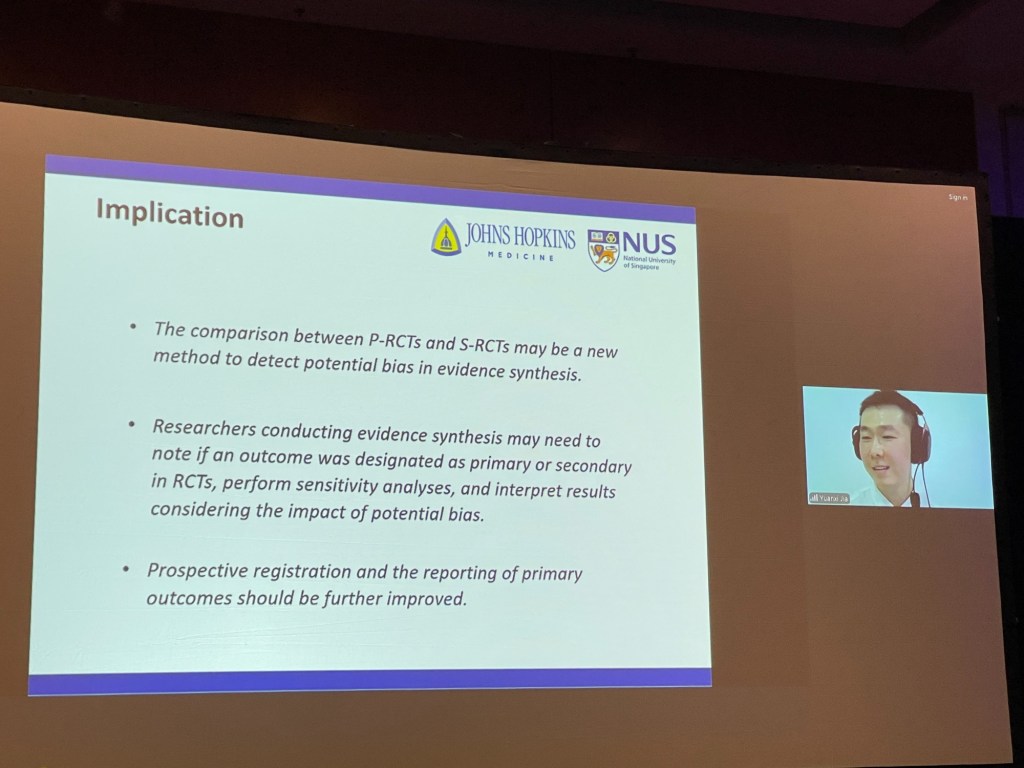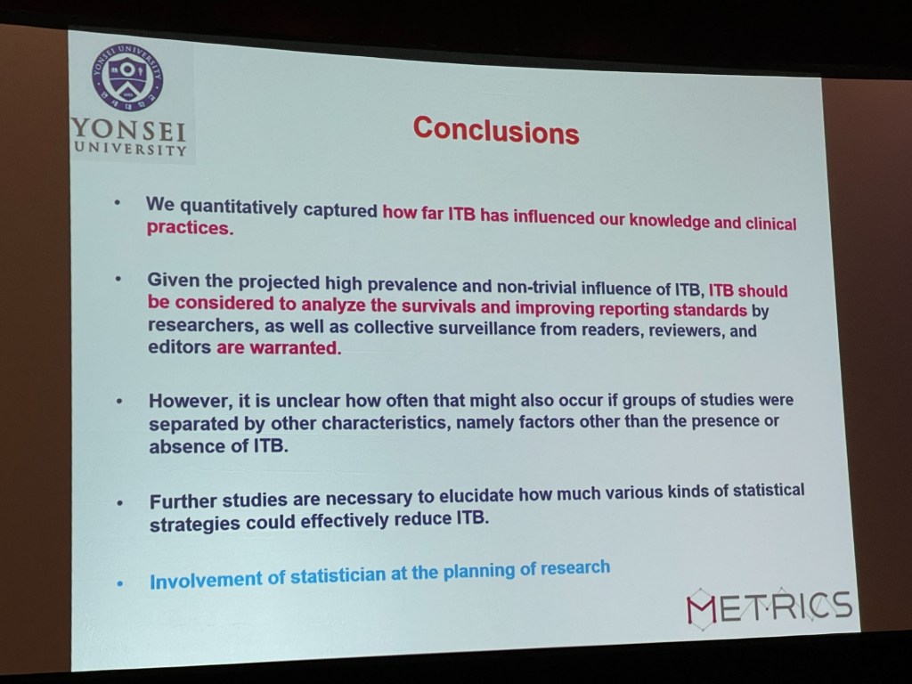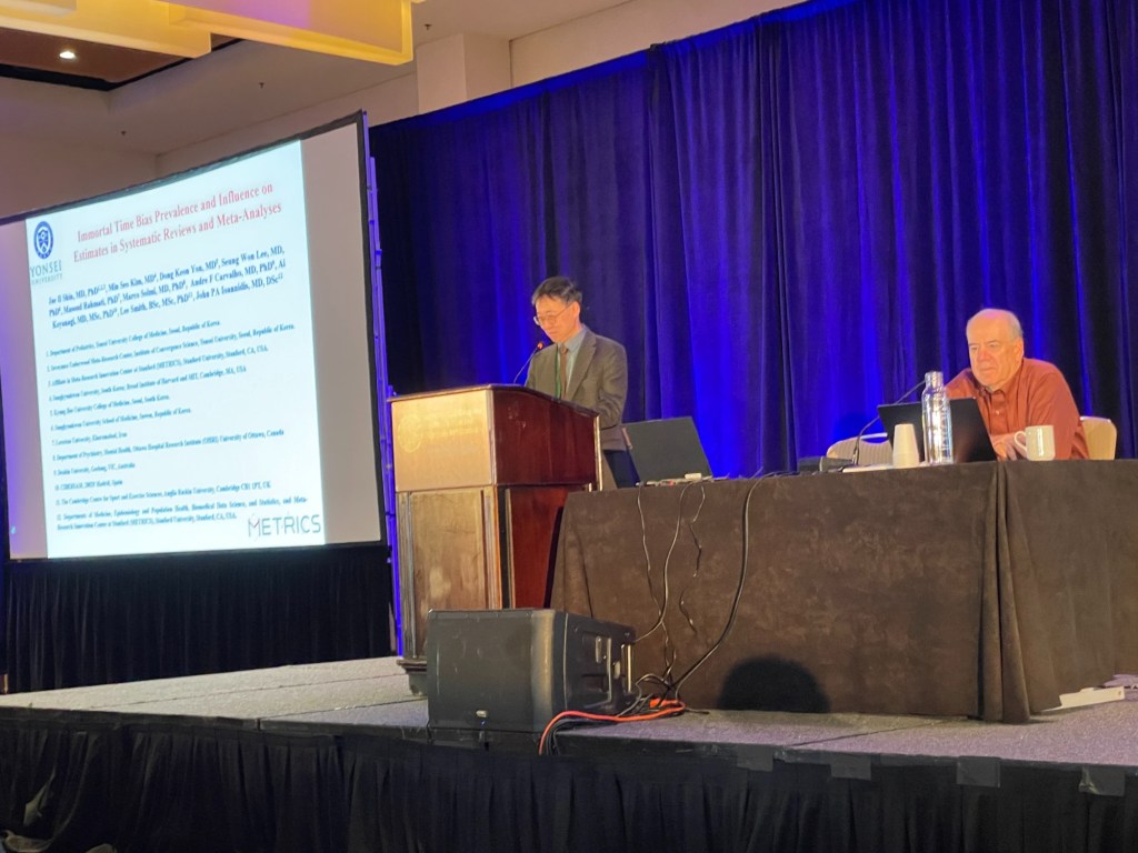 First: Jae Il Shin with ‘Bias, Study Outcomes, and Reporting Concerns Immortal Time Bias Prevalence and Effects on Estimates in Systematic Reviews and Meta-Analyses‘ Immortal time bias = ? (I cannot follow this talk because the introduction slide was shown too briefly).
