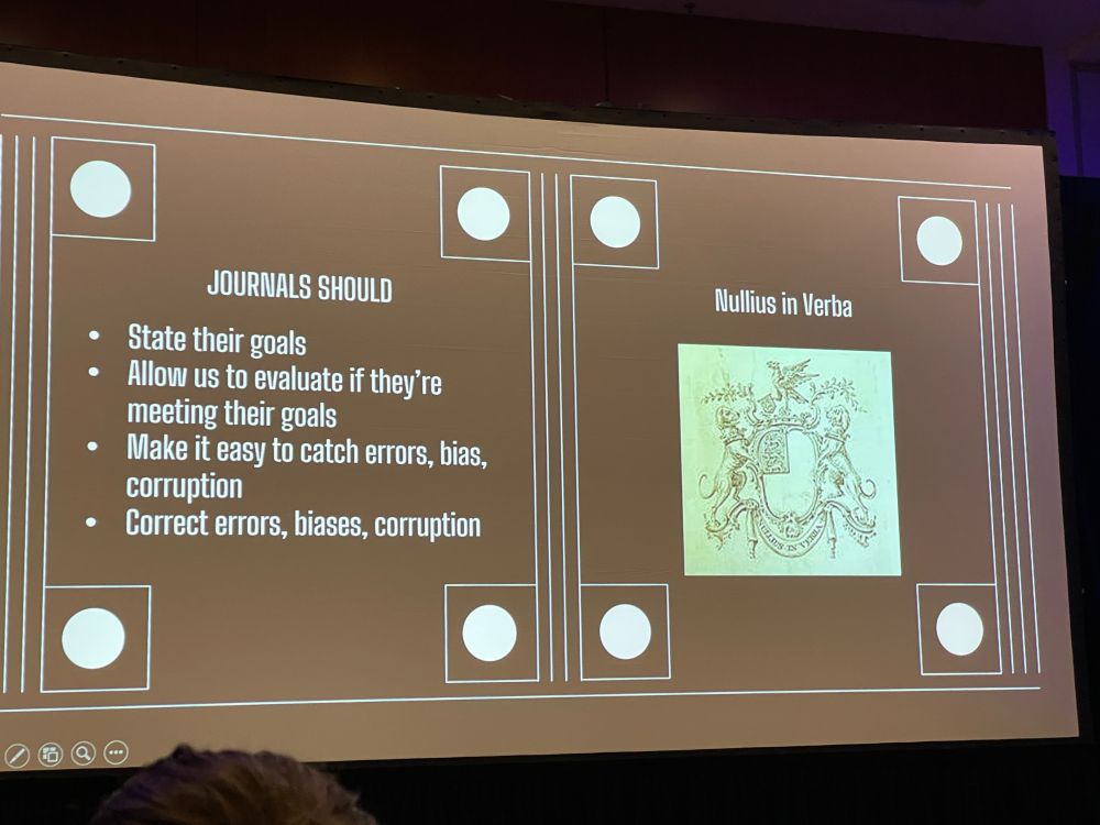 SV: The time has come to ask more of journals. Journals should state their goals, give us info to evaluate, catch and correct errors, biases, corruption. Nullius in Verba. Journals can do more: publish peer review history, require open data, declare CoI, policy for appeals, conduct audits.