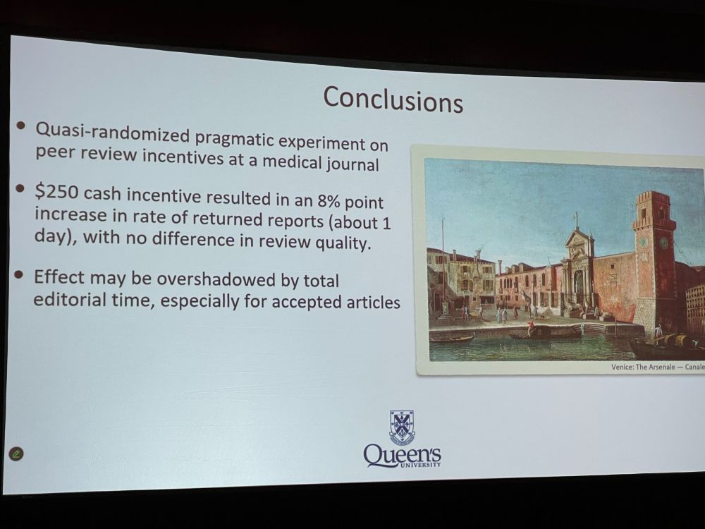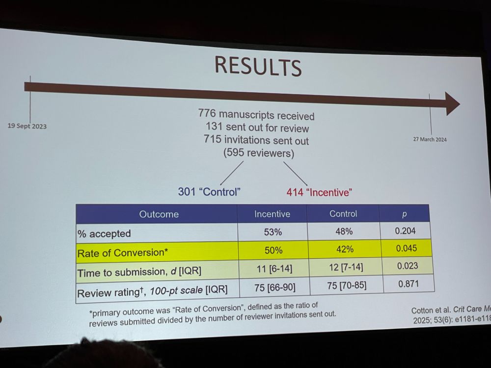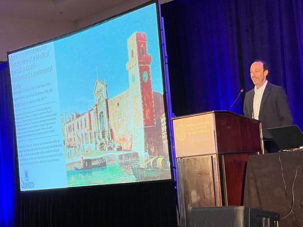Next: David Maslove with ‘Monetary Incentives for Peer Review at a Medical Journal: A Quasi-Randomized Experimental Study‘. Should we pay peer reviewers? We sent 2 letters, one offered USD $250 to review for Critical Care Medicine. Study: journals.lww.com/ccmjournal/a…