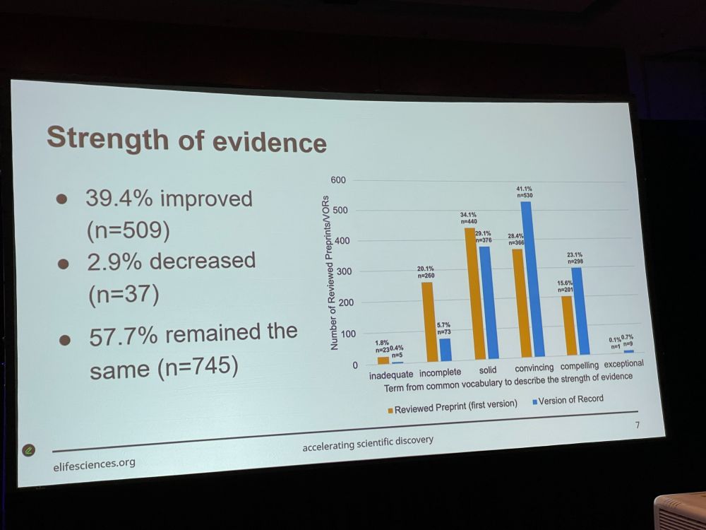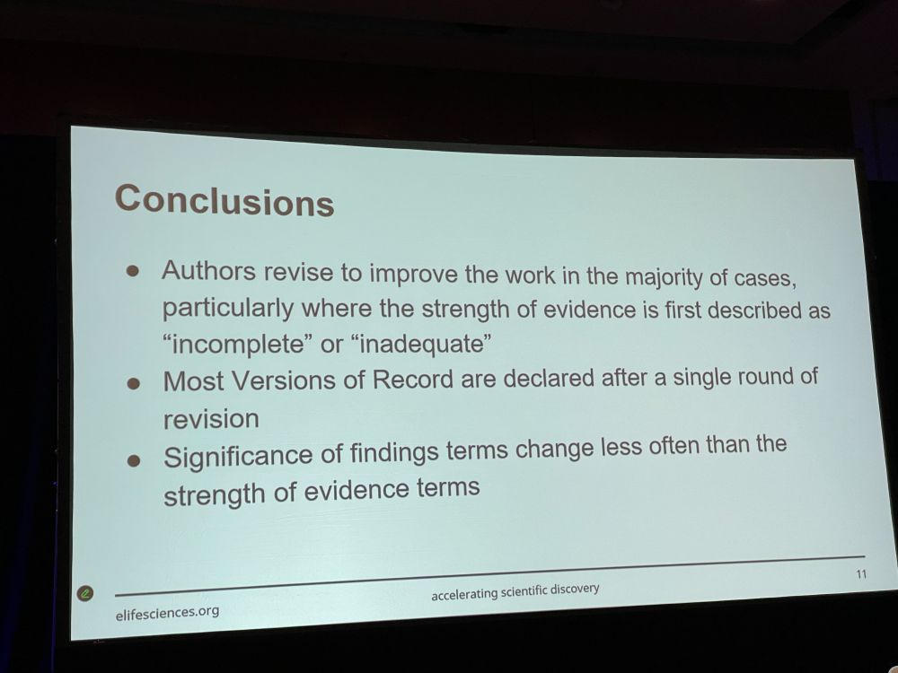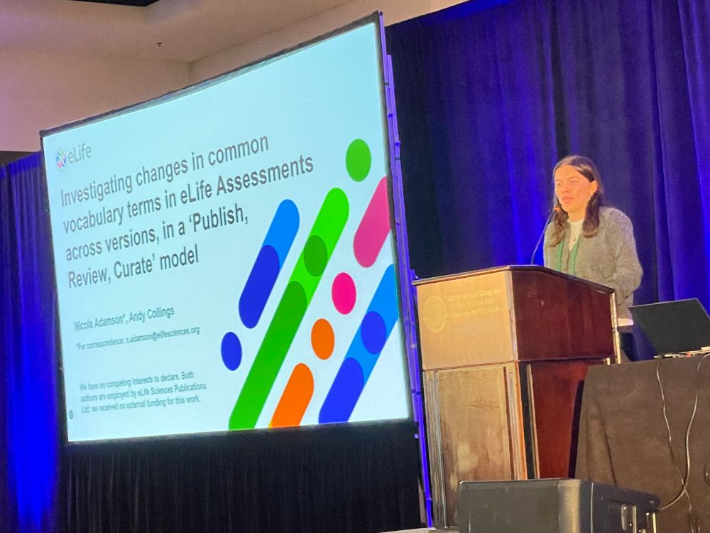 Next up: Nicola Adamson (who talks very fast) with ‘Investigating Changes in Common Vocabulary Terms in eLife Assessments Across Versions in a Publish, Review, Curate Model‘ – In Oct 2022 eLIfe announced a new model “Publish, Review, Curate”, papers sent out to peer review require a preprint.
