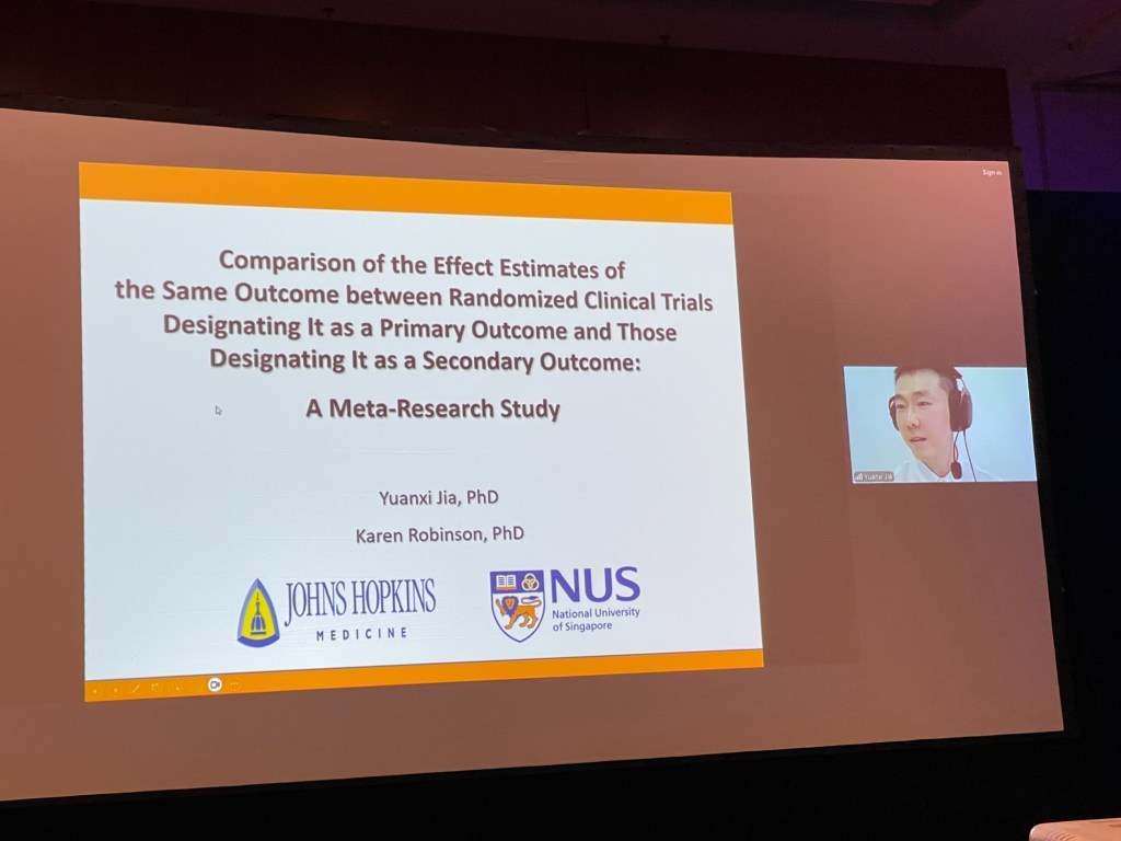 Next: Yiwen Jiang (online) with ‘Effect Estimates for the Same Outcomes Designated as Primary vs Secondary in Randomized Clinical Trials: A Meta-Research Study‘ [I do not even understand the title – how can the same outcome be both primary and secondary?? – this session is clearly over my head]