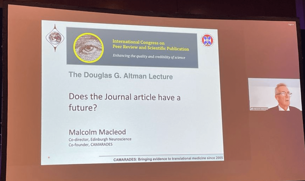 We will start with the Douglas G. Altman Lecture, by Malcolm MacLeod (online presentation) –@maclomaclee.bsky.social, with “Does the Journal Article Have a Future?” MM is presenting online, because hard to enter US and out of protest to a hostile environment to scientists.